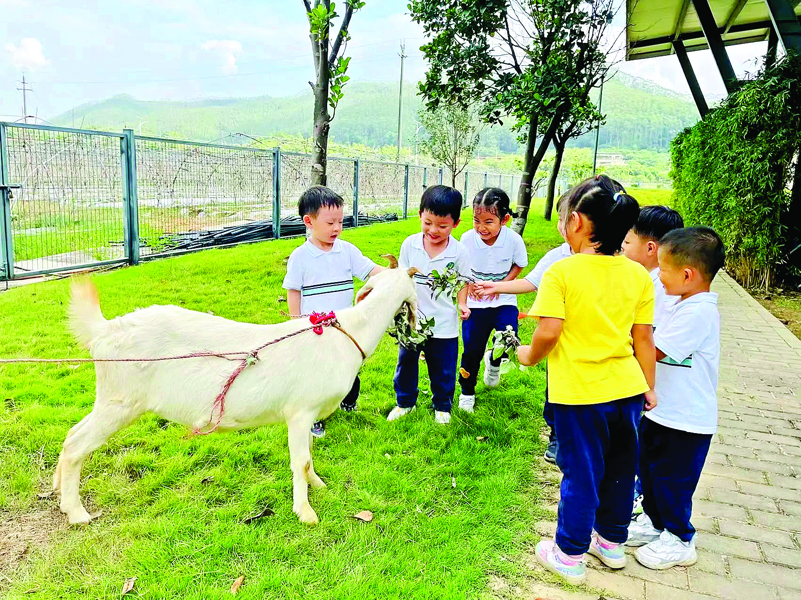 小朋友在農(nóng)場(chǎng)喂養(yǎng)動(dòng)物。