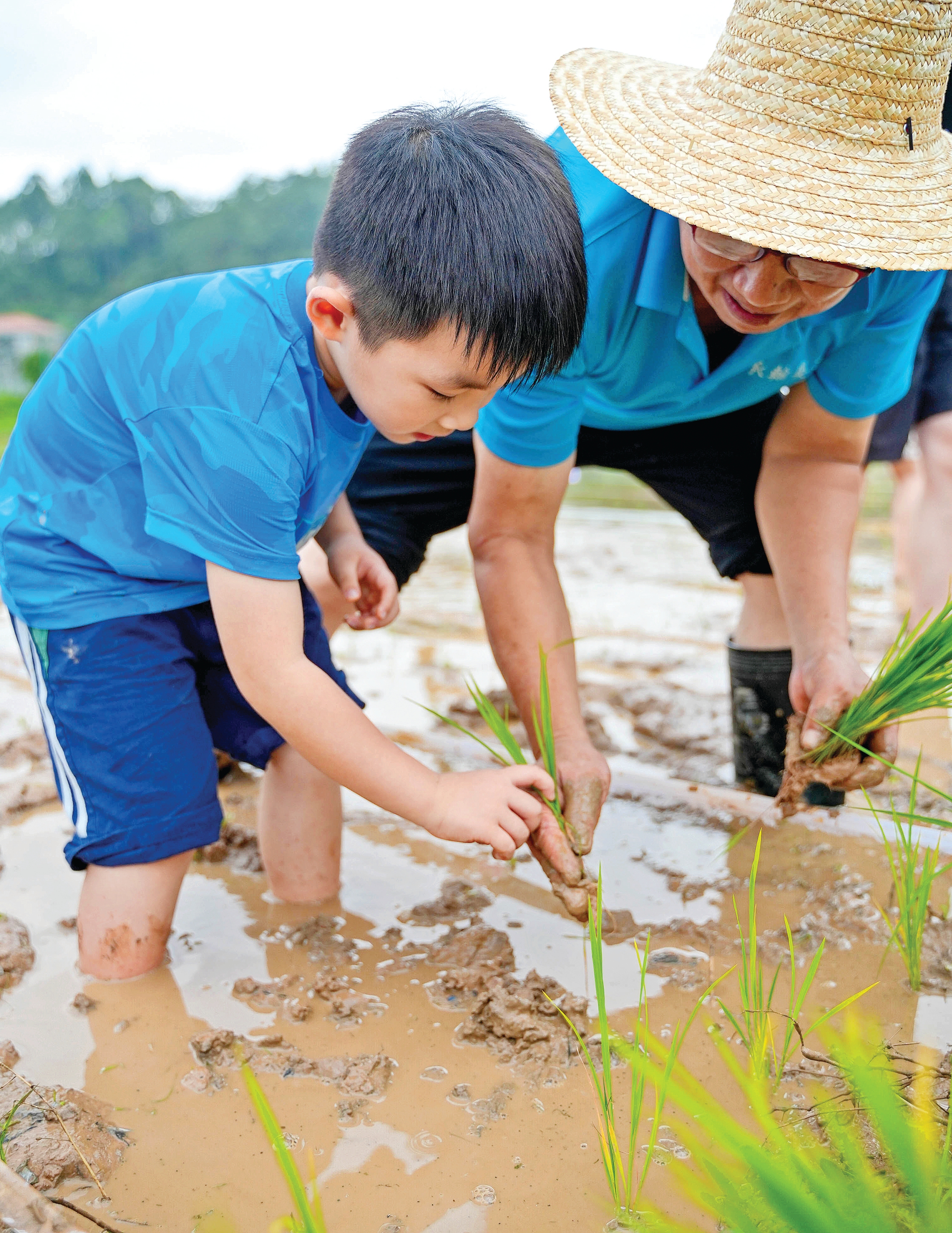 小朋友在農(nóng)場(chǎng)體驗(yàn)插秧。