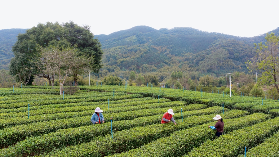 陳洞村茶園里,工人們穿梭在茶壟間采茶。惠州日?qǐng)?bào)記者湯渝杭 攝
