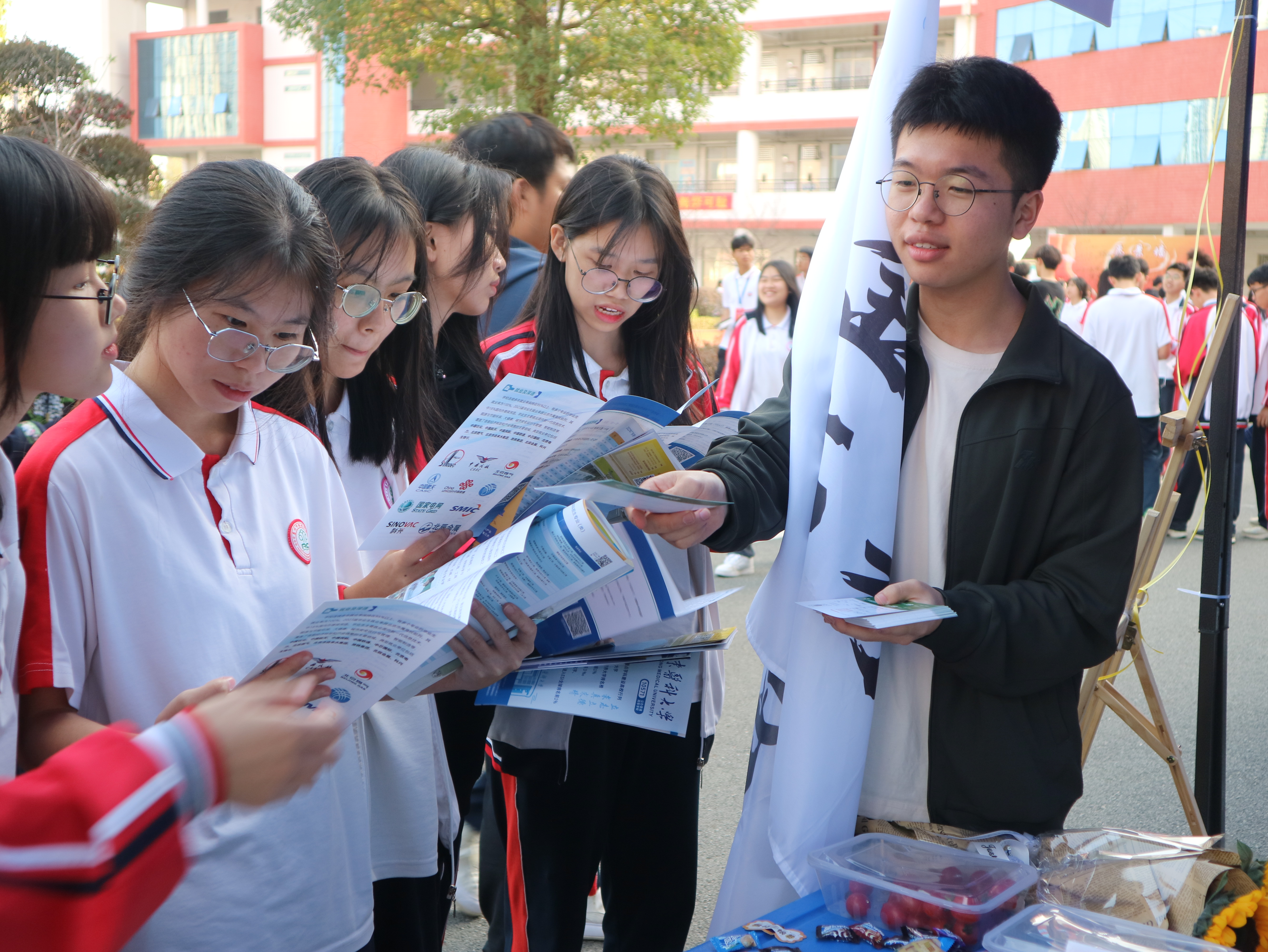 1月21日上午9時(shí)許,博羅中學(xué)教學(xué)樓廣場(chǎng)前熱鬧非凡。分列兩側(cè)的40余個(gè)帳篷內(nèi),有序擺放著40多所學(xué)校的宣傳冊(cè)等資料,大學(xué)生們熱情地向高中生講解學(xué)校特色并解疑釋惑。