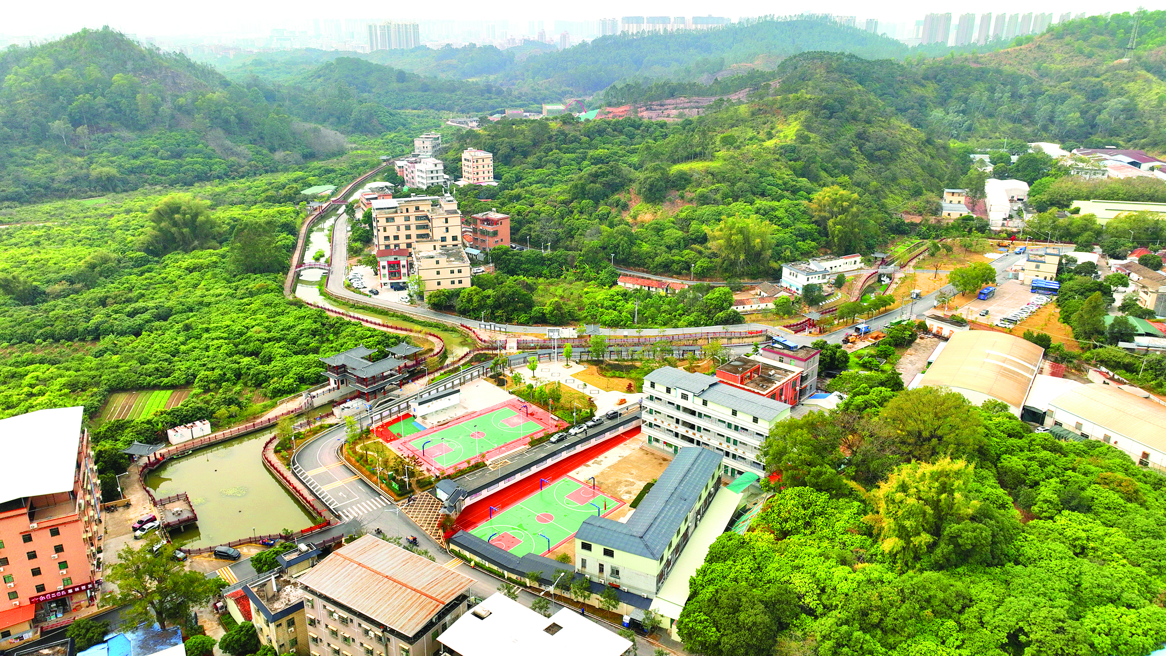 美麗鄉(xiāng)景與現(xiàn)代產(chǎn)業(yè)園區(qū)相互映襯的惠環(huán)街道西坑村。惠州日報(bào)記者鐘暢新 哈鵬 攝