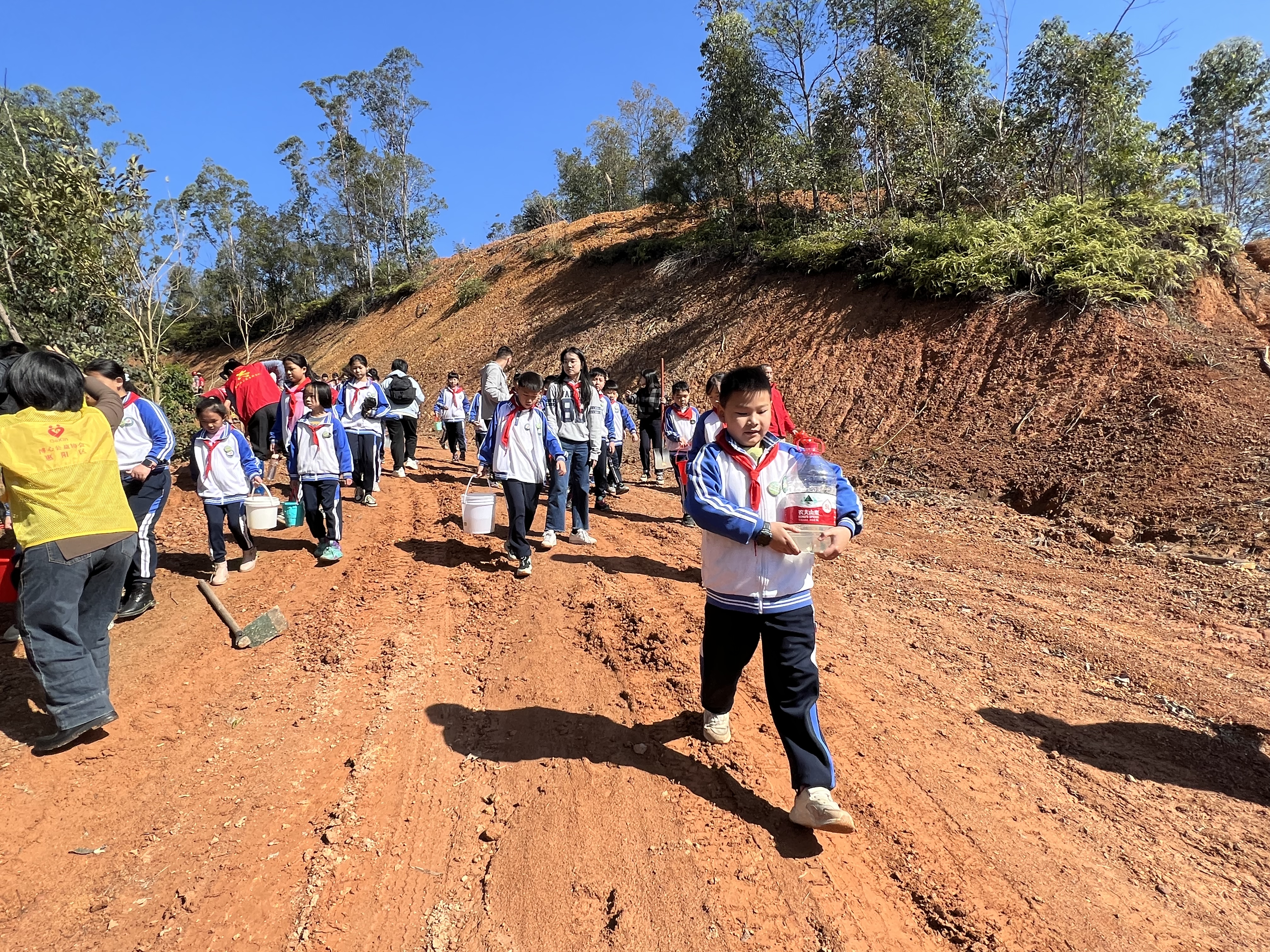 新圩小學(xué)生給新栽的樹(shù)苗澆水。