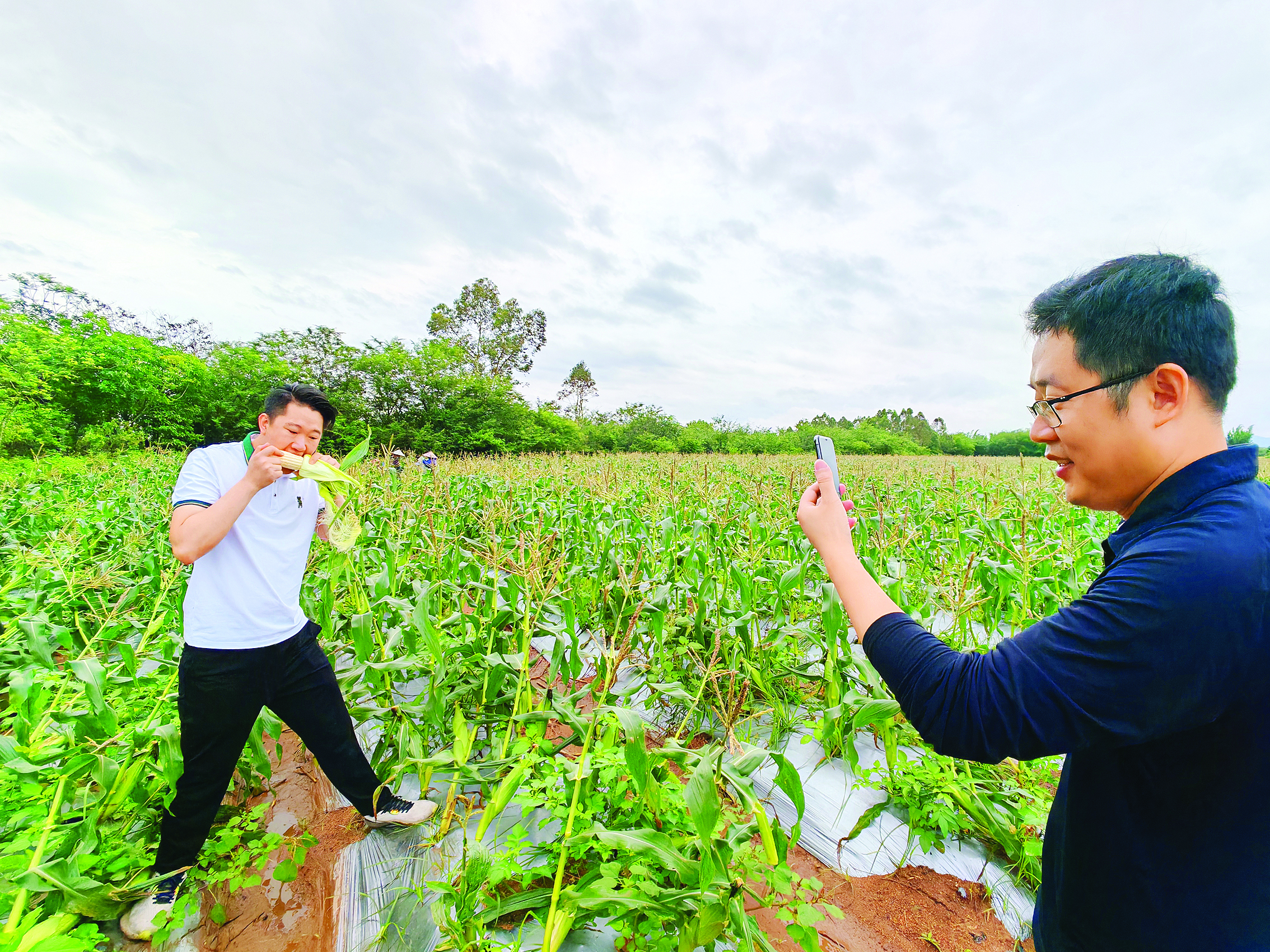 “這是剛采摘下來的水果玉米,看,口口爆汁……”日前,在惠陽區(qū)良井鎮(zhèn)橋背村東丫山農(nóng)場的一片玉米地里,粵良井團隊的農(nóng)業(yè)經(jīng)理人現(xiàn)場“吃播”,向五湖四海的網(wǎng)友推介剛上市的水果玉米。