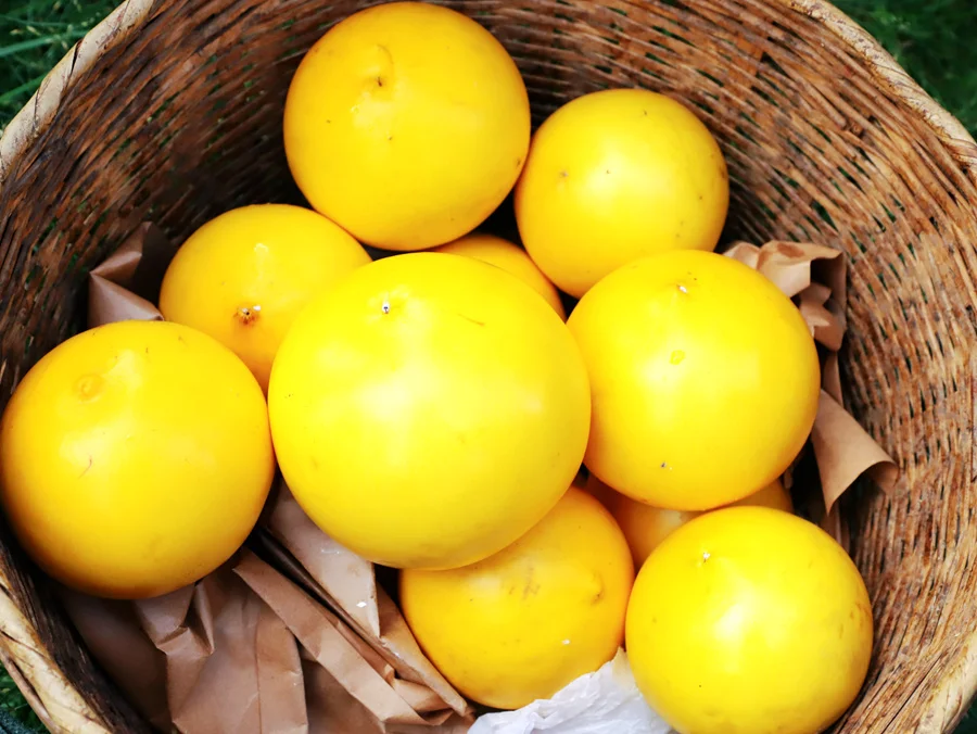 采摘下來(lái)的黃澄澄圓滾滾的黃晶果。