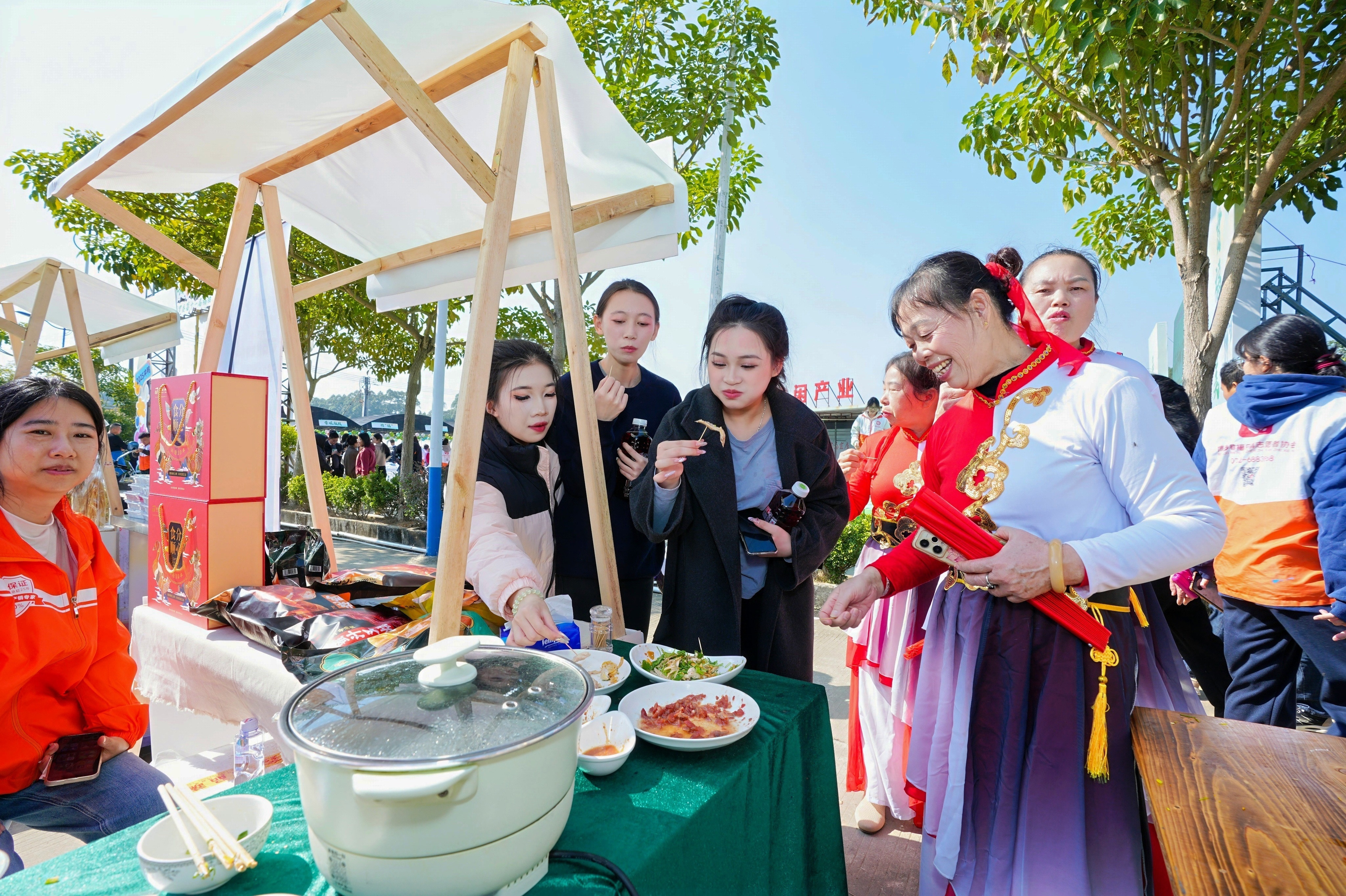 舞臺(tái)上,醒獅、變臉、手鼓等表演精彩紛呈。在互動(dòng)游戲區(qū),主辦方貼心準(zhǔn)備了一批新鮮“菜心花”供游客拍照。蒙眼敲鼓、投“福”等互動(dòng)游戲,吸引眾多游客參與。在農(nóng)產(chǎn)品展銷區(qū),農(nóng)特產(chǎn)品琳瑯滿目,眾多游客品嘗購(gòu)買。