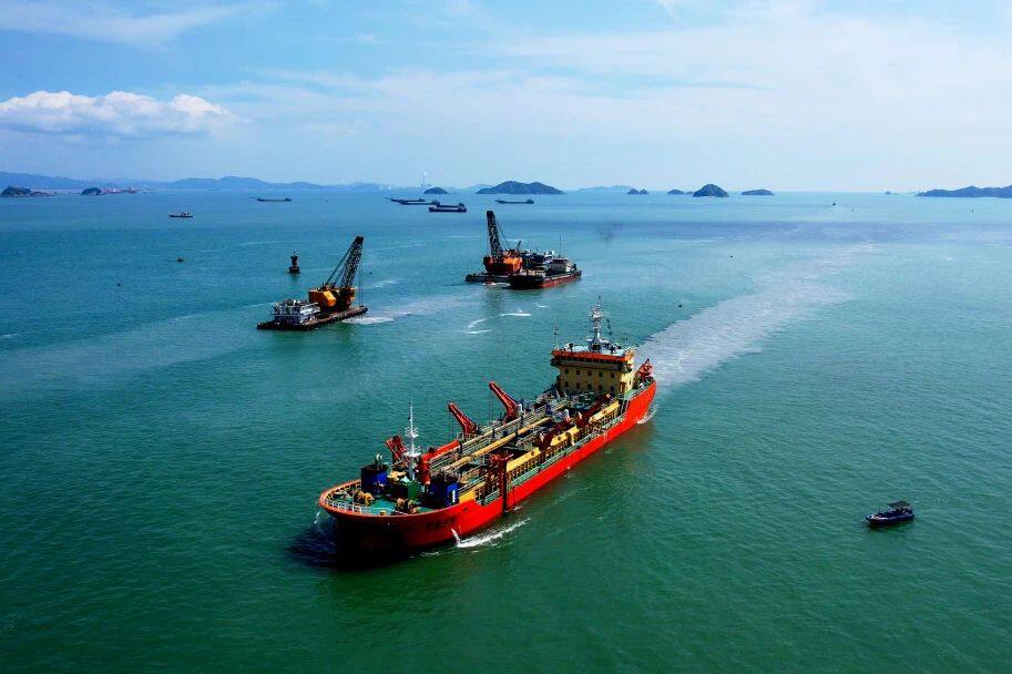 據(jù)介紹,該項目總方量達2000萬方,項目部累計投入耙吸船、抓斗船、鑿巖船等施工船舶30余艘,作業(yè)高峰期370余人,項目疏浚日產量多次突破20萬方,創(chuàng)造了行業(yè)施工新標高。