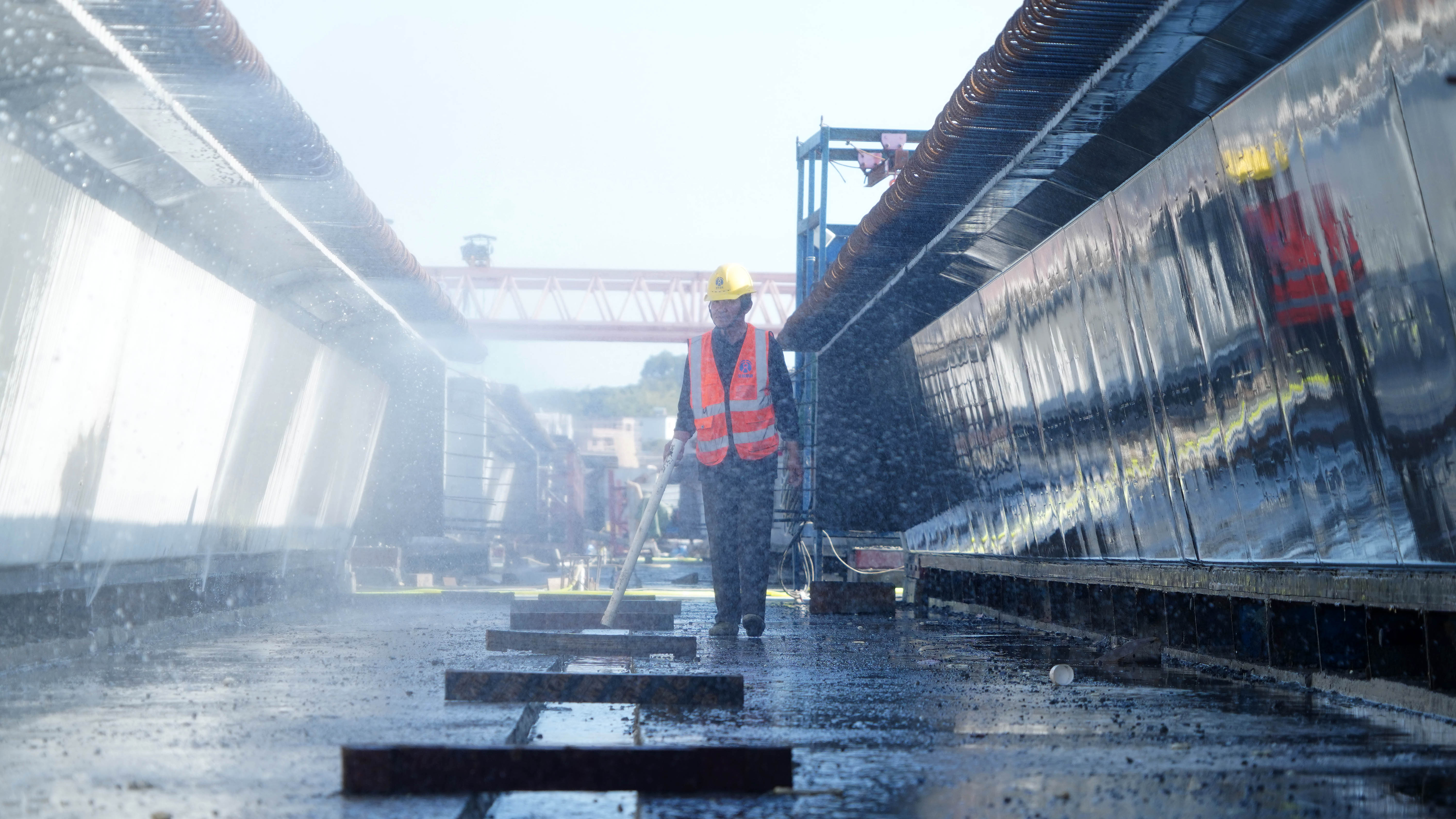在7號制梁場,一片片預(yù)制梁整齊地?cái)[放在場內(nèi),工人正在進(jìn)行預(yù)制梁養(yǎng)護(hù)。