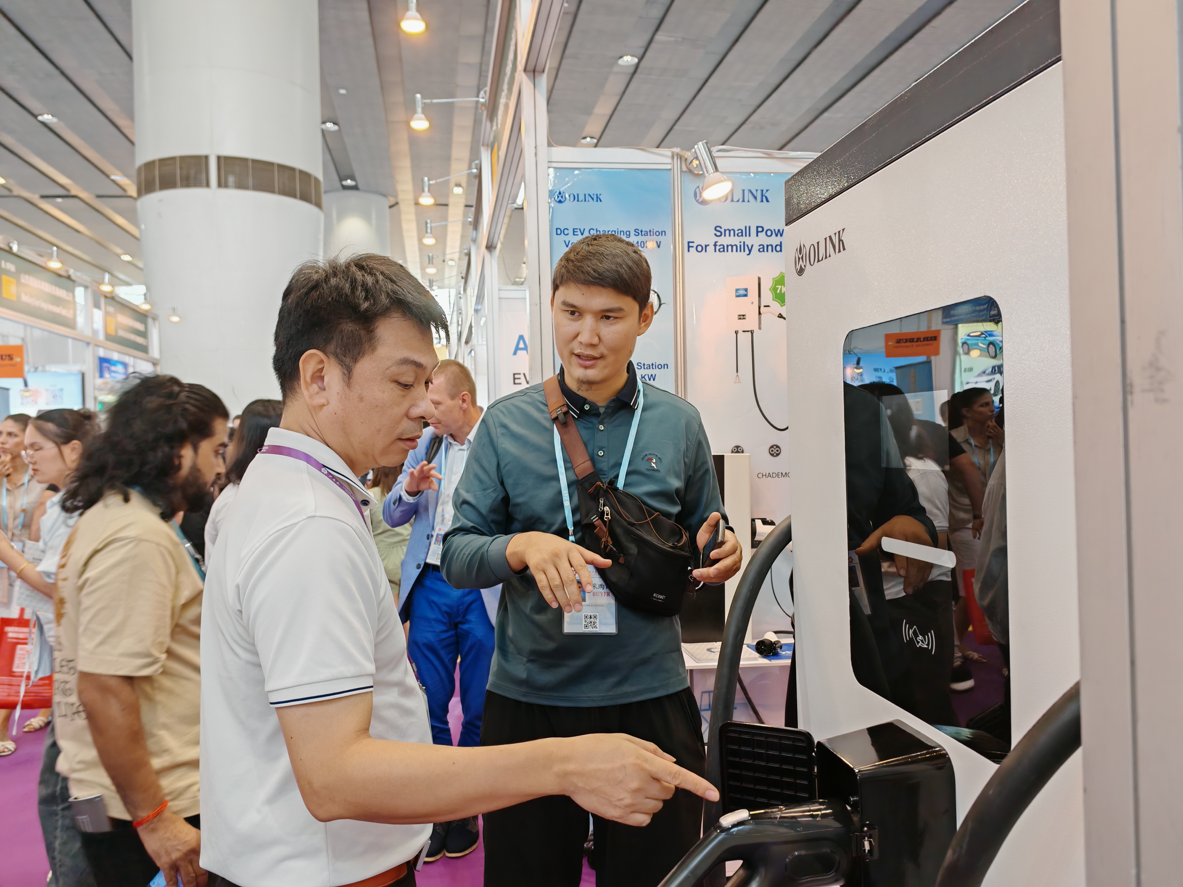 第138屆廣交會上,外國客商關(guān)注萬物互聯(lián)公司生產(chǎn)的“魔術(shù)充電樁”。惠州日報(bào)記者游璇鈺 陳春惠 攝