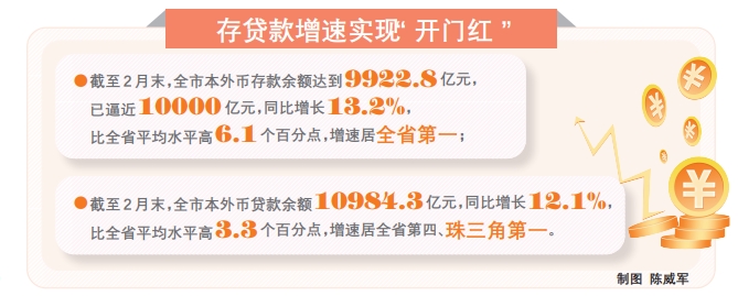 具體看,截至2月末,全市本外幣存款余額達(dá)到9922.8億元,已逼近10000億元,同比增長13.2%,比全省平均水平高6.1個(gè)百分點(diǎn),增速居全省第一;全市本外幣貸款余額10984.3億元,同比增長12.1%,比全省平均水平高3.3個(gè)百分點(diǎn),增速居全省第四、珠三角第一。