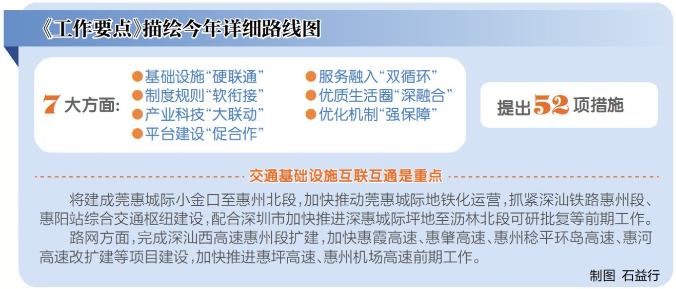 在大灣區(qū),惠州如何進(jìn)一步強(qiáng)化東部樞紐門戶地位?《工作要點(diǎn)》描繪了今年的詳細(xì)路線圖,聚焦基礎(chǔ)設(shè)施“硬聯(lián)通”、制度規(guī)則“軟銜接”、產(chǎn)業(yè)科技“大聯(lián)動(dòng)”、平臺(tái)建設(shè)“促合作”、服務(wù)融入“雙循環(huán)”、優(yōu)質(zhì)生活圈“深融合”、優(yōu)化機(jī)制“強(qiáng)保障”等七大方面,提出了52項(xiàng)措施,并明確了相應(yīng)的責(zé)任單位進(jìn)行落實(shí)。