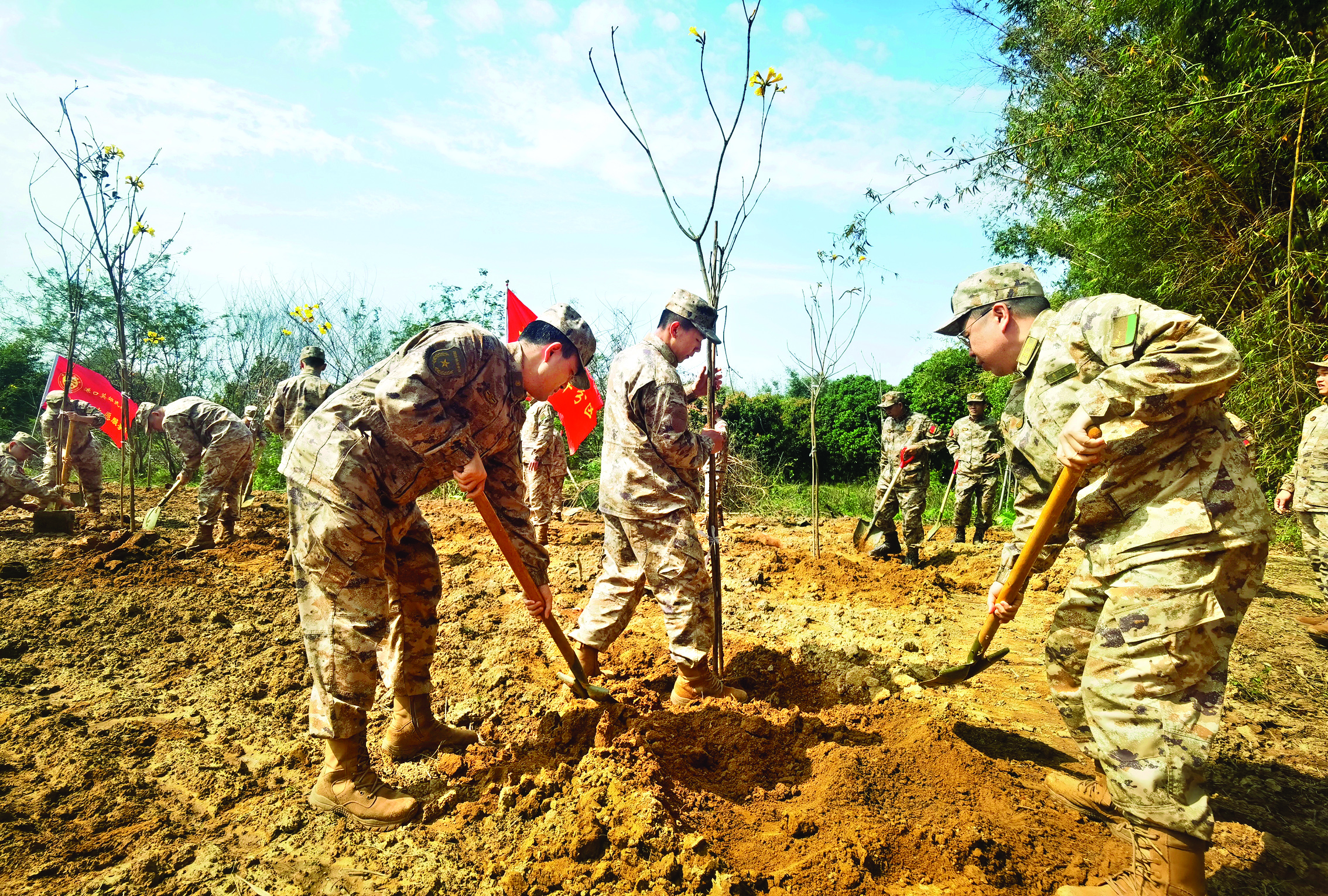 活動(dòng)當(dāng)天,官兵們揮鍬鏟土,植下200余株樹苗。 惠州日?qǐng)?bào)記者劉豪偉 通訊員王浩杰 攝
