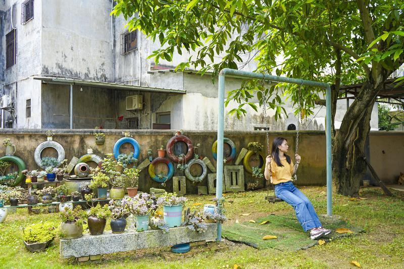 彩繪的舊輪胎、一個(gè)個(gè)盆景讓庭院美如畫。