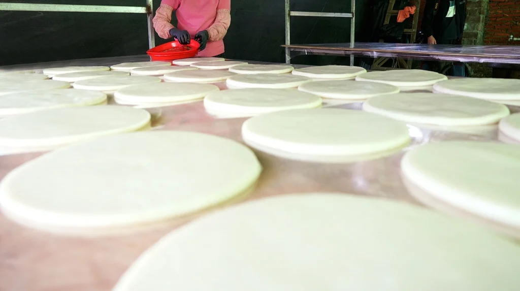 “一般我們到年十八就會開始做,一直做到年廿八。等到春節(jié)走親訪友,我們就會帶上一對或者兩對,搭配幾顆橘子作為伴手禮,好看又體面,深受大家喜愛。”張進金說,臨近春節(jié),水糍的訂單明顯增加,他們每天能生產(chǎn)約2000個,并按照2個一對進行售賣。