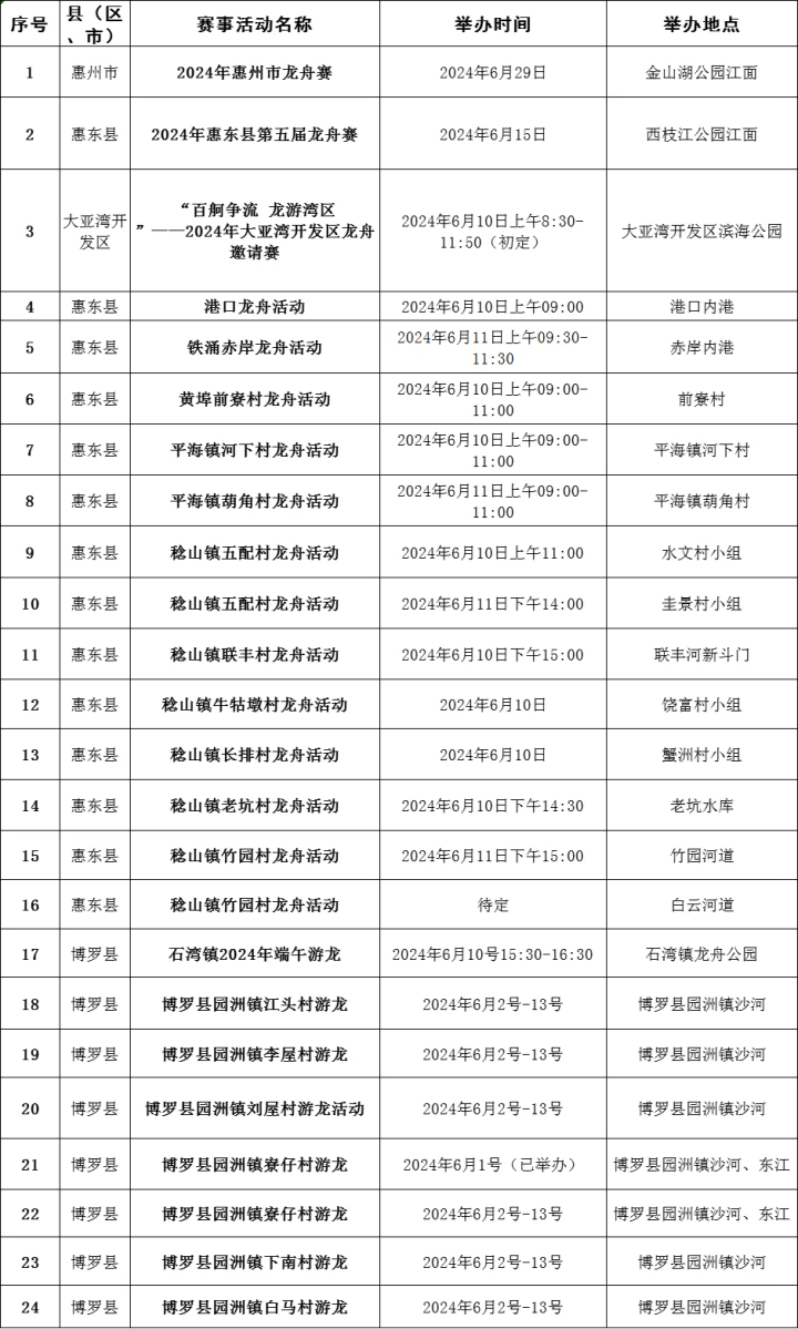 6月2日至13日,博羅縣園洲鎮(zhèn)將舉行一系列游龍活動(dòng),江頭村、李屋村、劉屋村、寮仔村和下南村將分別在沙河和東江舉辦“游龍”活動(dòng)。6月10日,博羅縣石灣鎮(zhèn)將在龍舟公園舉辦2024年端午“游龍”活動(dòng),從沙河羅浮山東江大橋處游行至龍舟公園廣場。