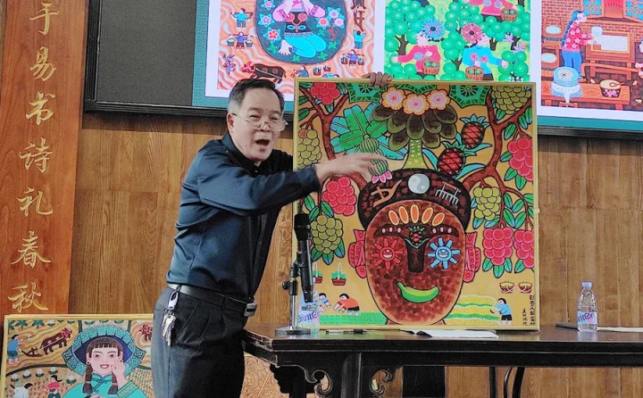講座中,王漢池講述了龍門農(nóng)民畫的發(fā)展歷史、繪畫技巧和主要成就,他以自己的作品《客家山歌農(nóng)民畫組畫》為例,闡述龍門農(nóng)民畫是一種隨著時代發(fā)展而不斷創(chuàng)新發(fā)展的畫種,充滿藝術(shù)張力和生命力。