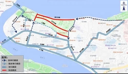 (二)濱江東路/黃家塘街交叉口至濱江東路/東江沙路交叉口路段,調(diào)整為車輛東往西單向通行。