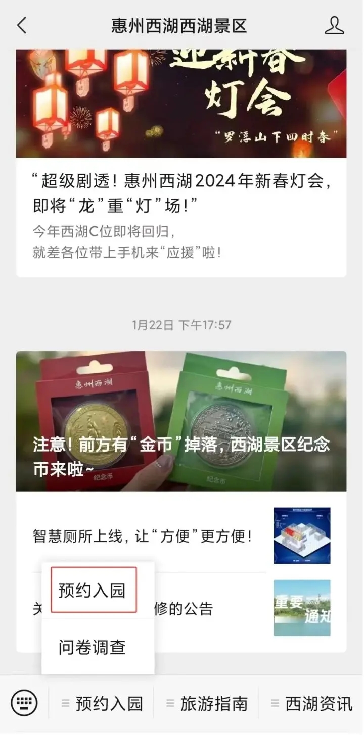 (一)通過“ 惠州西湖西湖景區(qū) ”公眾號或“惠州西湖景區(qū)”小程序進入預(yù)約界面。
