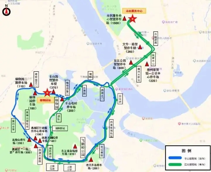 去程時,可將車輛停放在植物園片區(qū)(植物園停車場、豐山智慧停車場、植物園二期停車場)、高榜山片區(qū)(高榜山停車場、惠城區(qū)行政服務(wù)中心停車場、西湖大劇院停車場)、惠城區(qū)“一場三館”停車場)、飛鵝嶺片區(qū)(東江體育場智慧停車場、老汽車站停車場)等停車場,在就近的公交站點乘坐接駁線,在豐渚園站點下車,步行從西湖小北門進入,或在百花洲站點下車,步行從西湖東門進入。