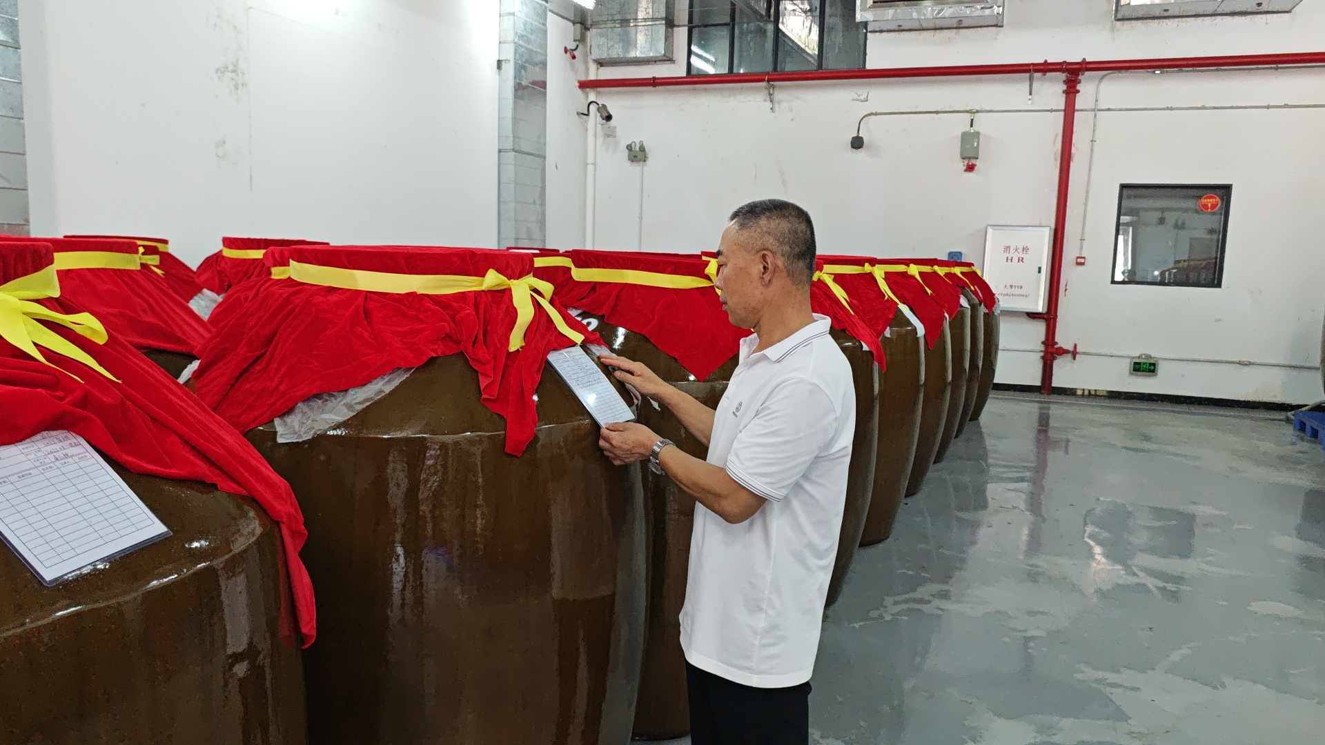 工作人員檢查酒缸的情況。