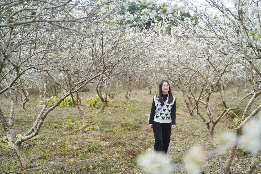 微風(fēng)吹來,落英繽紛,李花宛如雪花飄落。伸出纖纖玉手,接住落花,有黛玉的憂傷,亦有寶釵的靈動(dòng)。片片落花染白了枯黃的草地,別有一番風(fēng)味。捏著枝條,以雪白的草地為前景,以盛放的李花為背景,定格一張美照,著實(shí)驚艷。
