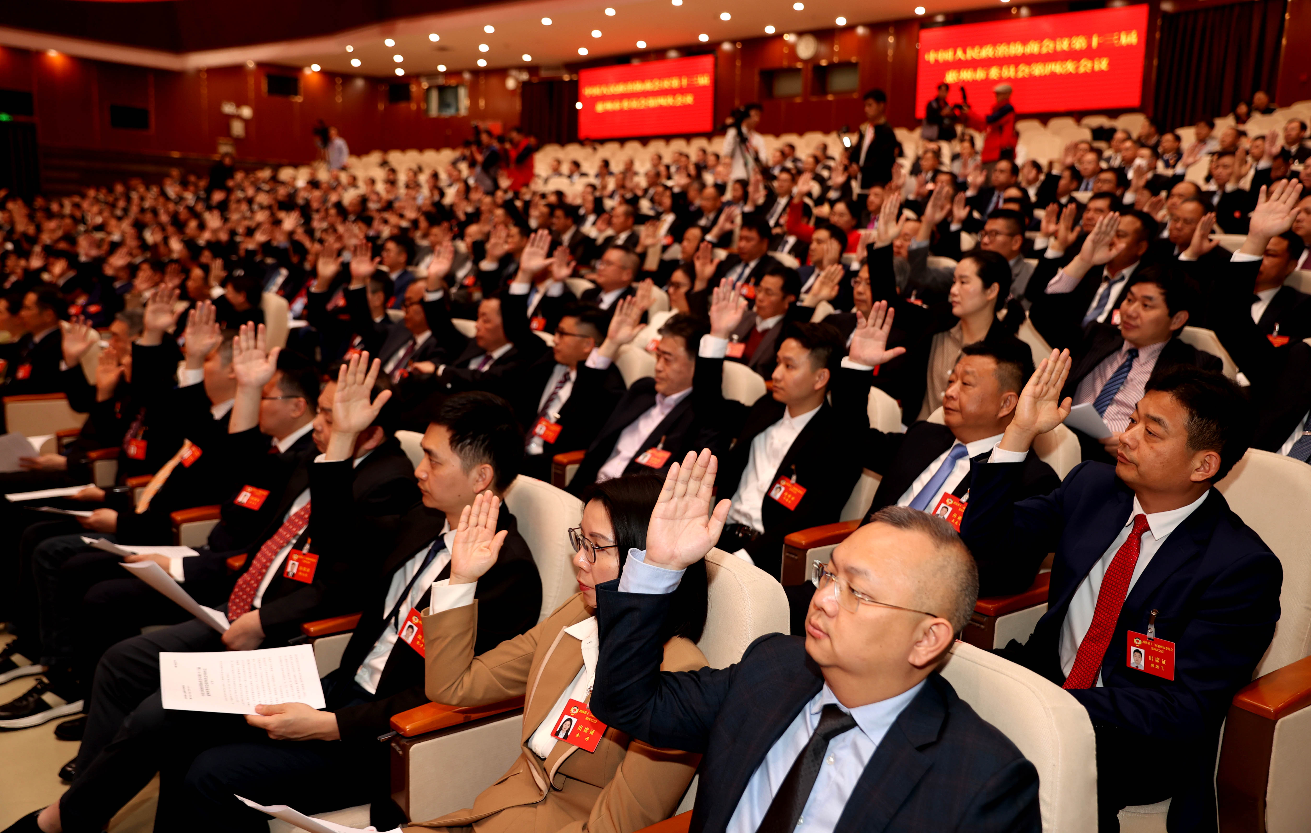 2月20日下午,參加政協(xié)第十三屆惠州市委員會(huì)第四次會(huì)議閉幕會(huì)的委員在舉手表決。 惠州日?qǐng)?bào)記者李松權(quán) 攝