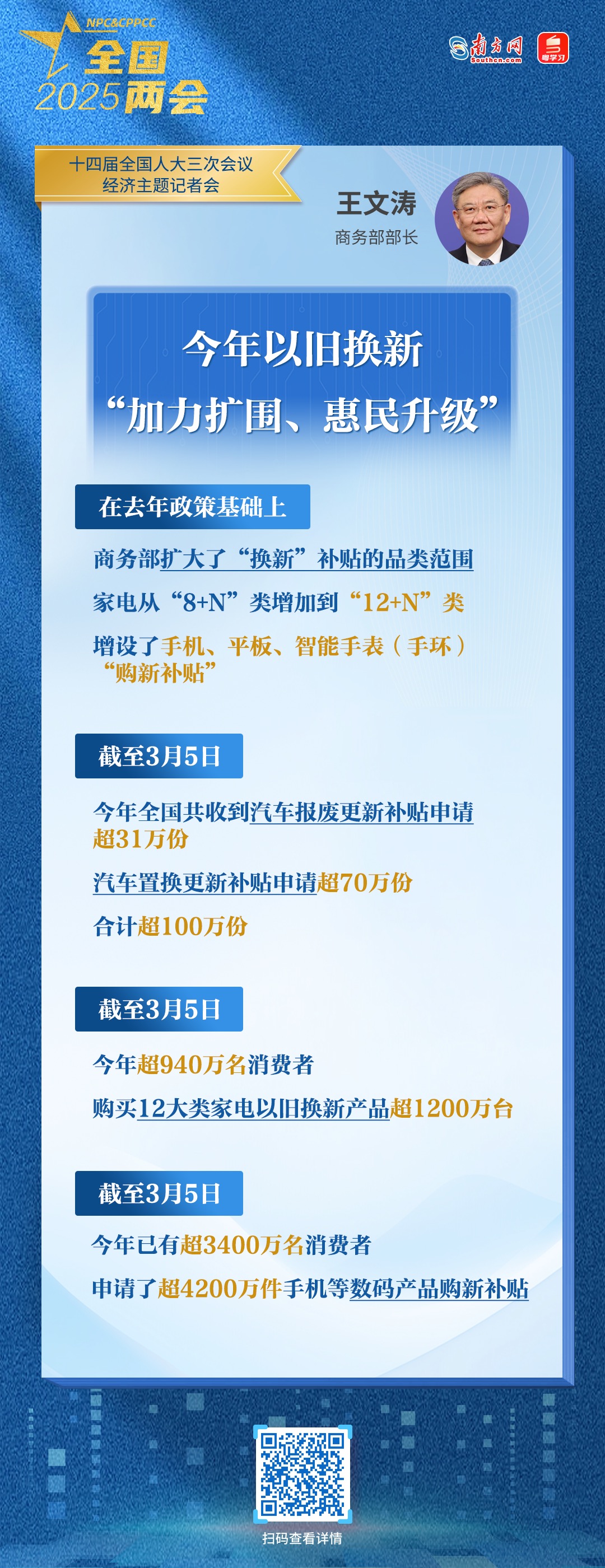 王文濤補(bǔ)充,截至3月5日,全國(guó)共收到2025年汽車報(bào)廢更新補(bǔ)貼申請(qǐng)超31萬(wàn)份,汽車置換更新補(bǔ)貼申請(qǐng)超70萬(wàn)份,合計(jì)超過(guò)100萬(wàn)份;超940萬(wàn)名消費(fèi)者購(gòu)買12大類家電以舊換新產(chǎn)品超1200萬(wàn)臺(tái);已有超3400萬(wàn)名消費(fèi)者申請(qǐng)了超4200萬(wàn)件手機(jī)等數(shù)碼產(chǎn)品購(gòu)新補(bǔ)貼。