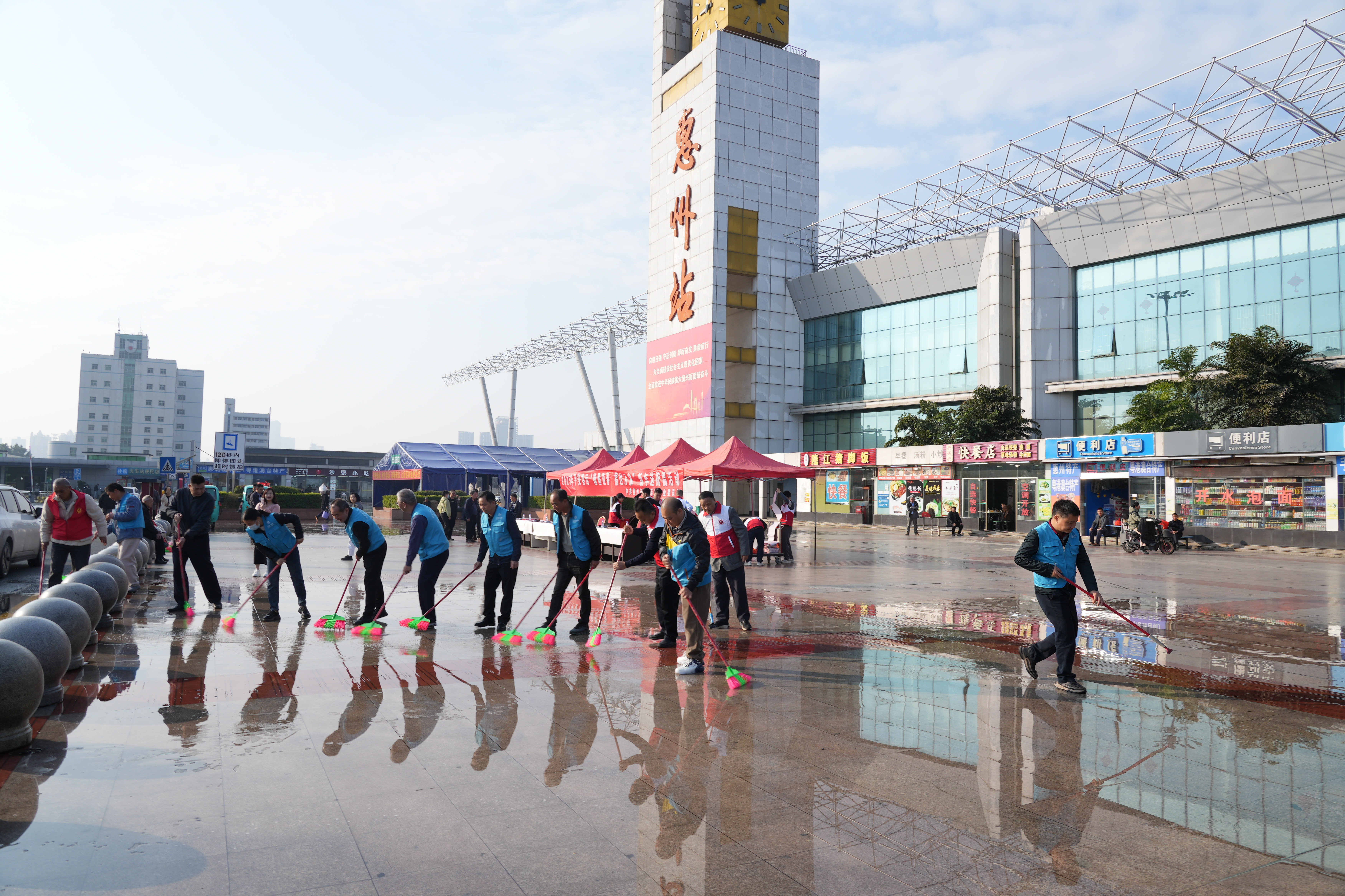 志愿者及環(huán)衛(wèi)工人在惠州火車站清掃。惠州日報記者朱金贊 攝