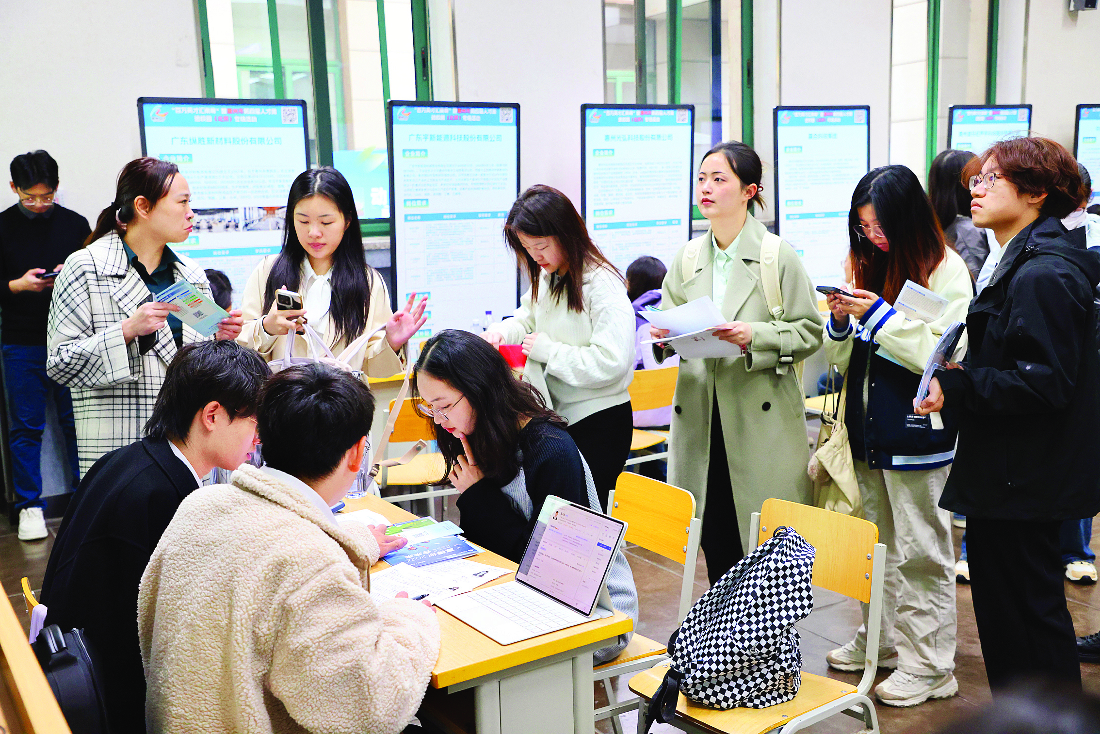 人大學(xué)子在我市的企業(yè)招聘位前咨詢。惠州日?qǐng)?bào)記者王建橋 攝