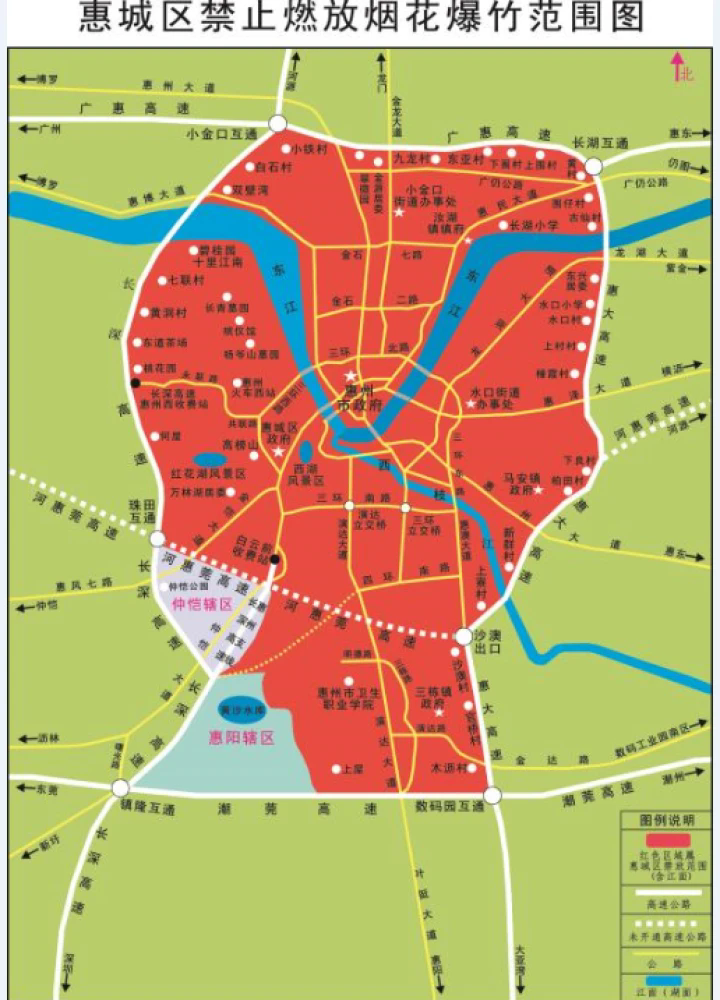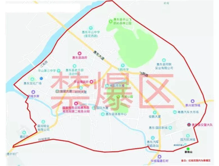 其中,惠城區(qū)禁燃區(qū)范圍,東面為惠大高速長(zhǎng)湖互通→惠大高速→潮莞高速數(shù)碼園互通;南面為潮莞高速數(shù)碼園互通→潮莞高速→長(zhǎng)深高速鎮(zhèn)隆互通;西面為長(zhǎng)深高速鎮(zhèn)隆互通→長(zhǎng)深高速→長(zhǎng)深高速惠州支線與河惠莞高速交叉處→河惠莞高速→河惠莞高速珠田互通→長(zhǎng)深高速→廣惠高速小金口互通;北面為廣惠高速小金口互通→廣惠高速→惠大高速長(zhǎng)湖互通。