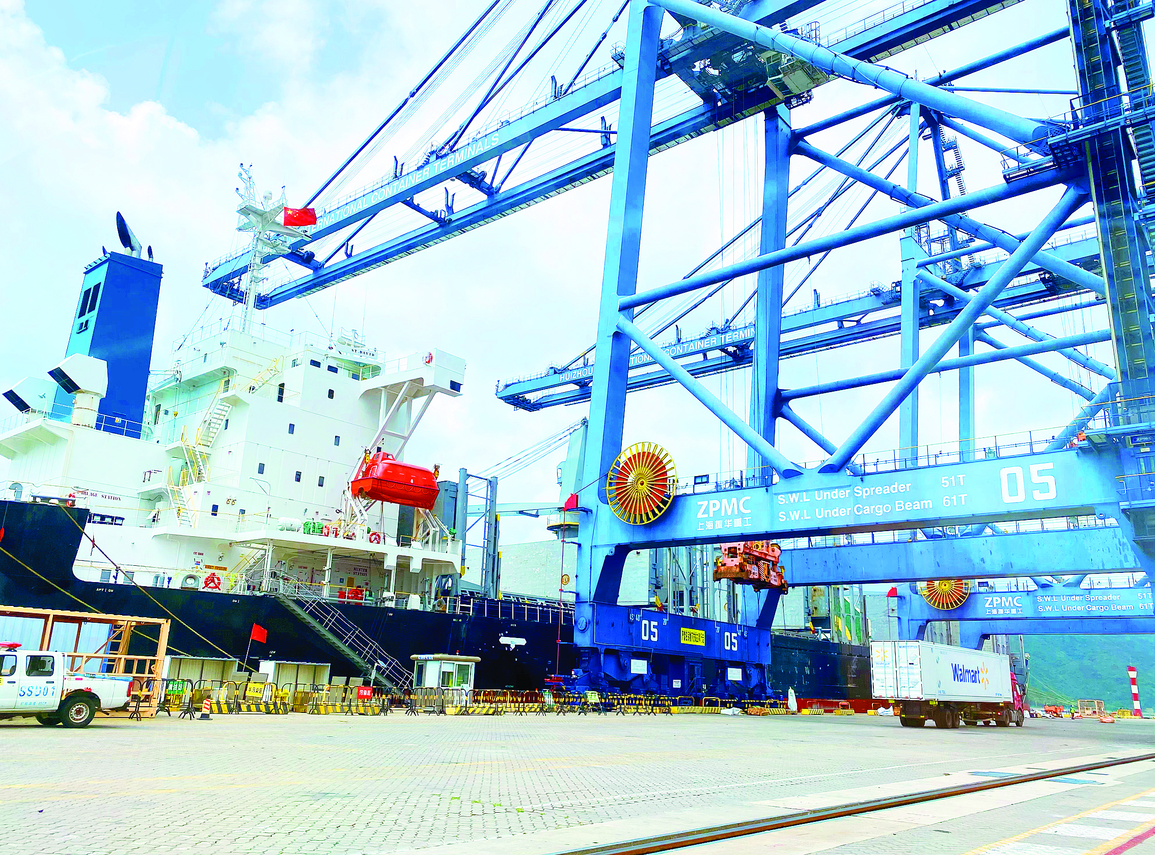 惠州港國際集裝箱碼頭正在進(jìn)行出境集裝箱裝卸作業(yè)。惠州日報(bào)記者劉煒煒 通訊員吳雨霏 攝