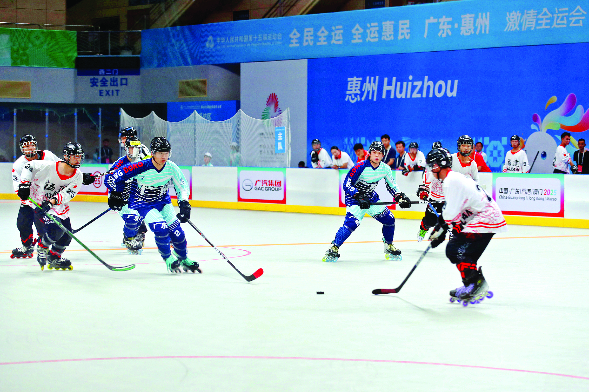 10月15日晚,第十五屆全運(yùn)會單排輪滑球項(xiàng)目決賽男子組小組賽,廣東隊(duì)(藍(lán)衣)13:1戰(zhàn)勝福建隊(duì)(白衣)。 惠州日報(bào)記者鐘暢新 攝