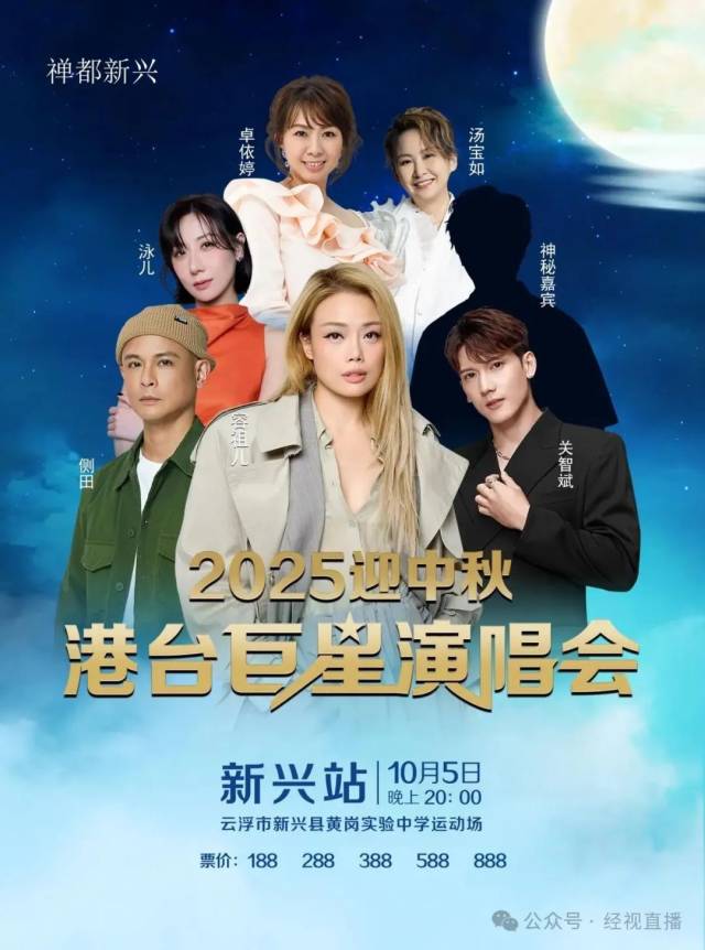 近日,有網(wǎng)友發(fā)帖稱(chēng),廣東省云浮市新興縣黃崗實(shí)驗(yàn)中學(xué)運(yùn)動(dòng)場(chǎng)將于10月5日舉辦“2025迎中秋港臺(tái)巨星演唱會(huì)”。該網(wǎng)友發(fā)布的演出海報(bào)顯示,表演嘉賓包括容祖兒、關(guān)智斌、側(cè)田、卓依婷、泳兒、湯寶如,以及一位神秘嘉賓,門(mén)票價(jià)格區(qū)間為188元至888元。