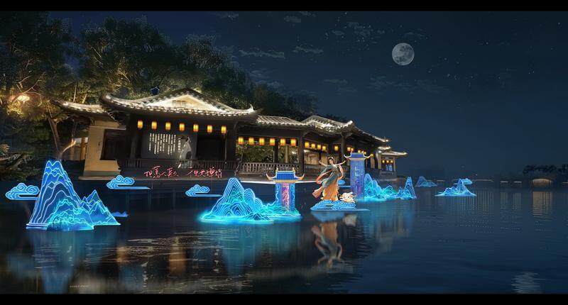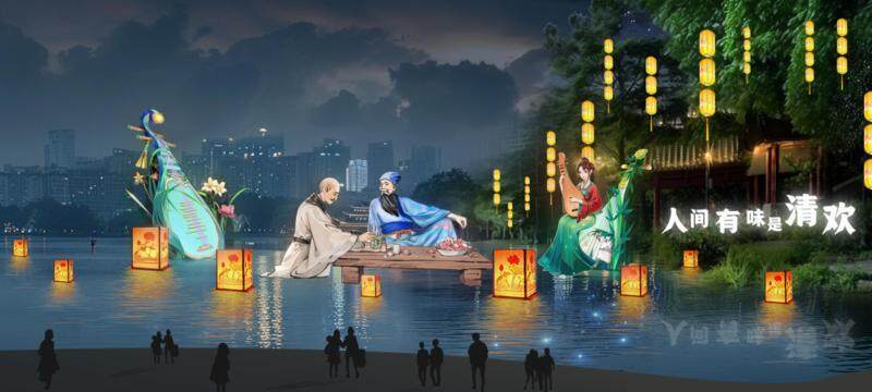 燈組“千年之約”場(chǎng)景設(shè)計(jì)來(lái)源于蘇東坡寓惠兩年多對(duì)惠州巨大的貢獻(xiàn),充分利用東坡、朝云、亭山樓閣等元素,營(yíng)造出“天上宮闕”般的場(chǎng)景,如夢(mèng)如幻仿佛穿越時(shí)空回到一千年前,與東坡有個(gè)跨越時(shí)空的約定。