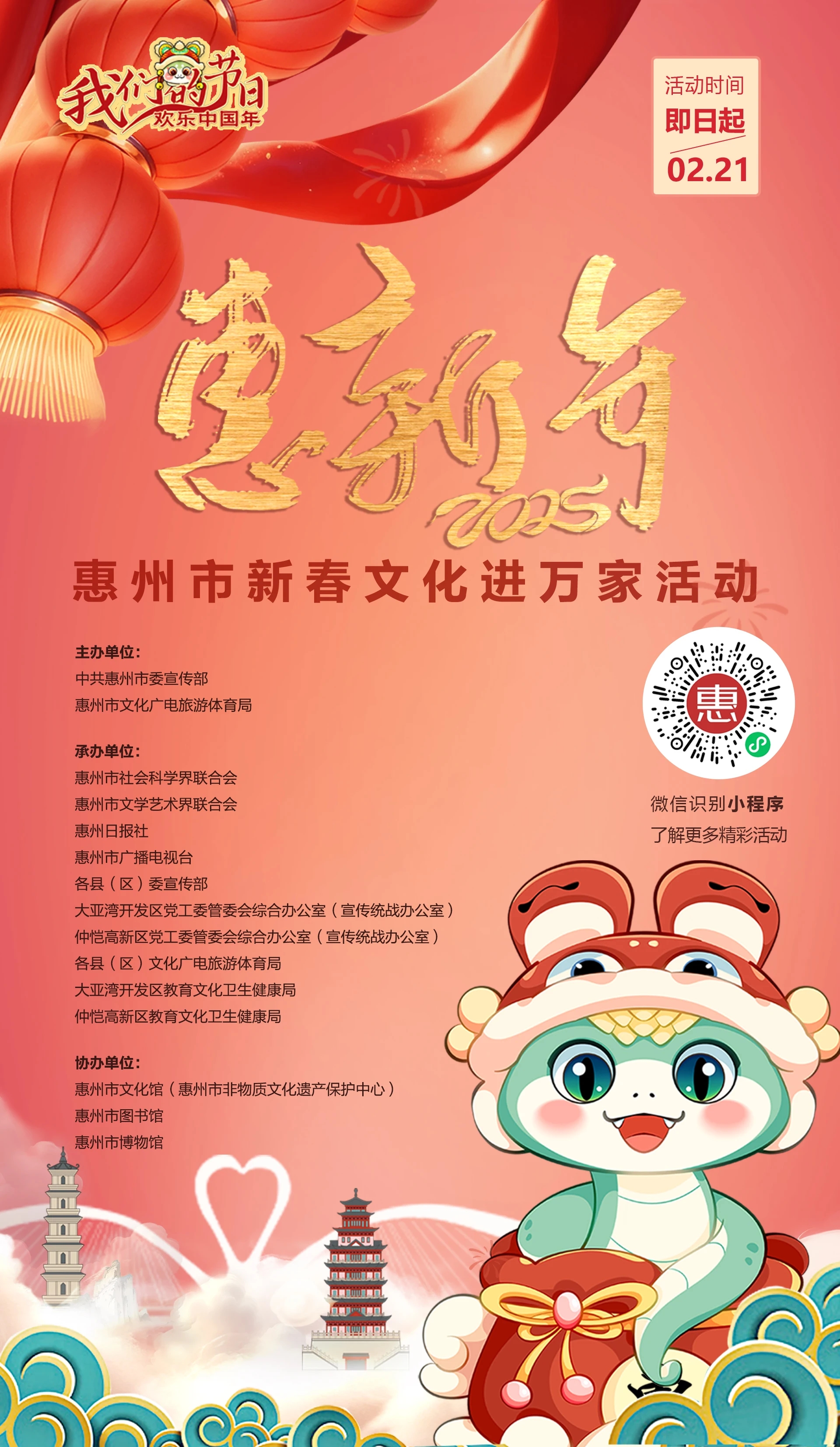 本次活動由中共惠州市委宣傳部、惠州市文化廣電旅游體育局主辦,旨在積極推動文化傳承發(fā)展和繁榮興盛,深入實(shí)施2025年“我們的中國夢——文化進(jìn)萬家”活動,以形式多樣的文化活動營造歡樂吉祥、溫暖和順的濃厚節(jié)日氛圍。