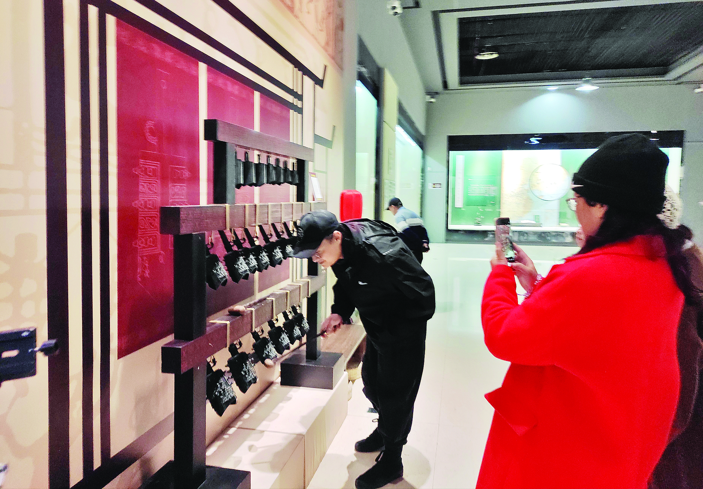 在惠州博物館,市民體驗(yàn)編鐘(仿制)演奏。