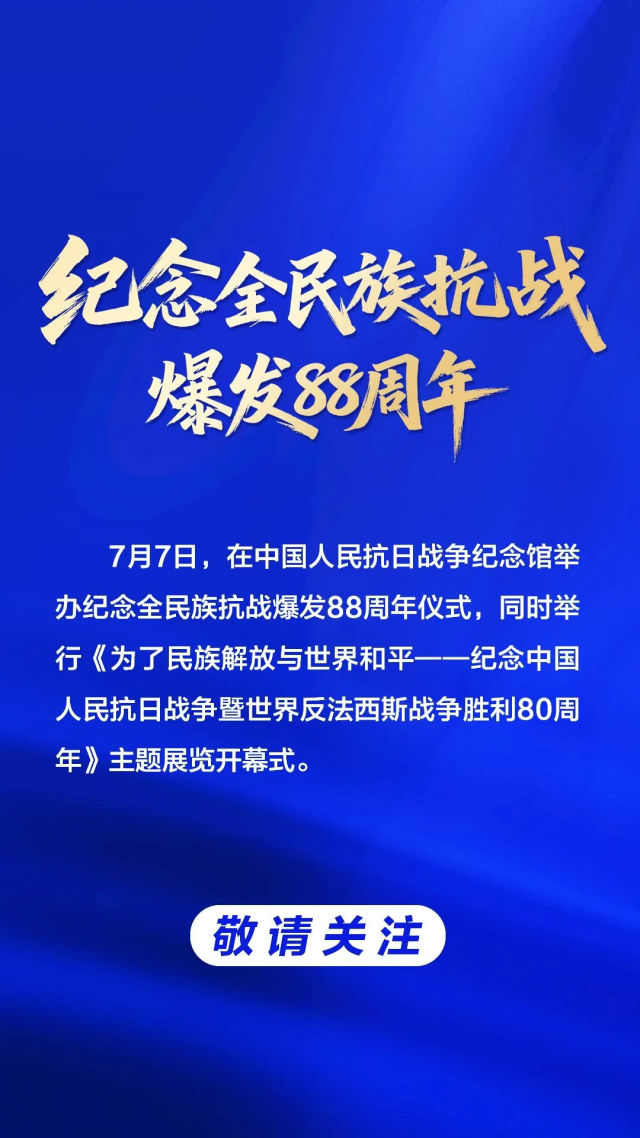 據(jù)“中國人民抗日戰(zhàn)爭紀(jì)念館”微信公眾號消息,7月7日,在中國人民抗日戰(zhàn)爭紀(jì)念館舉辦紀(jì)念全民族抗戰(zhàn)爆發(fā)88周年儀式,同時舉行《為了民族解放與世界和平——紀(jì)念中國人民抗日戰(zhàn)爭暨世界反法西斯戰(zhàn)爭勝利80周年》主題展覽開幕式。