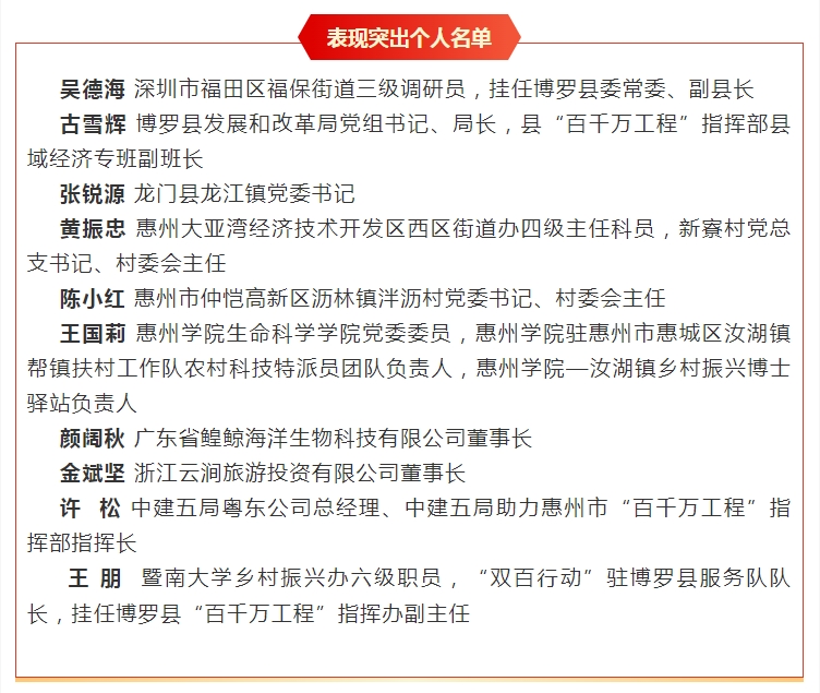 其中,惠州7個集體上榜表現(xiàn)突出集體名單,10位個人上榜表現(xiàn)突出個人名單。
