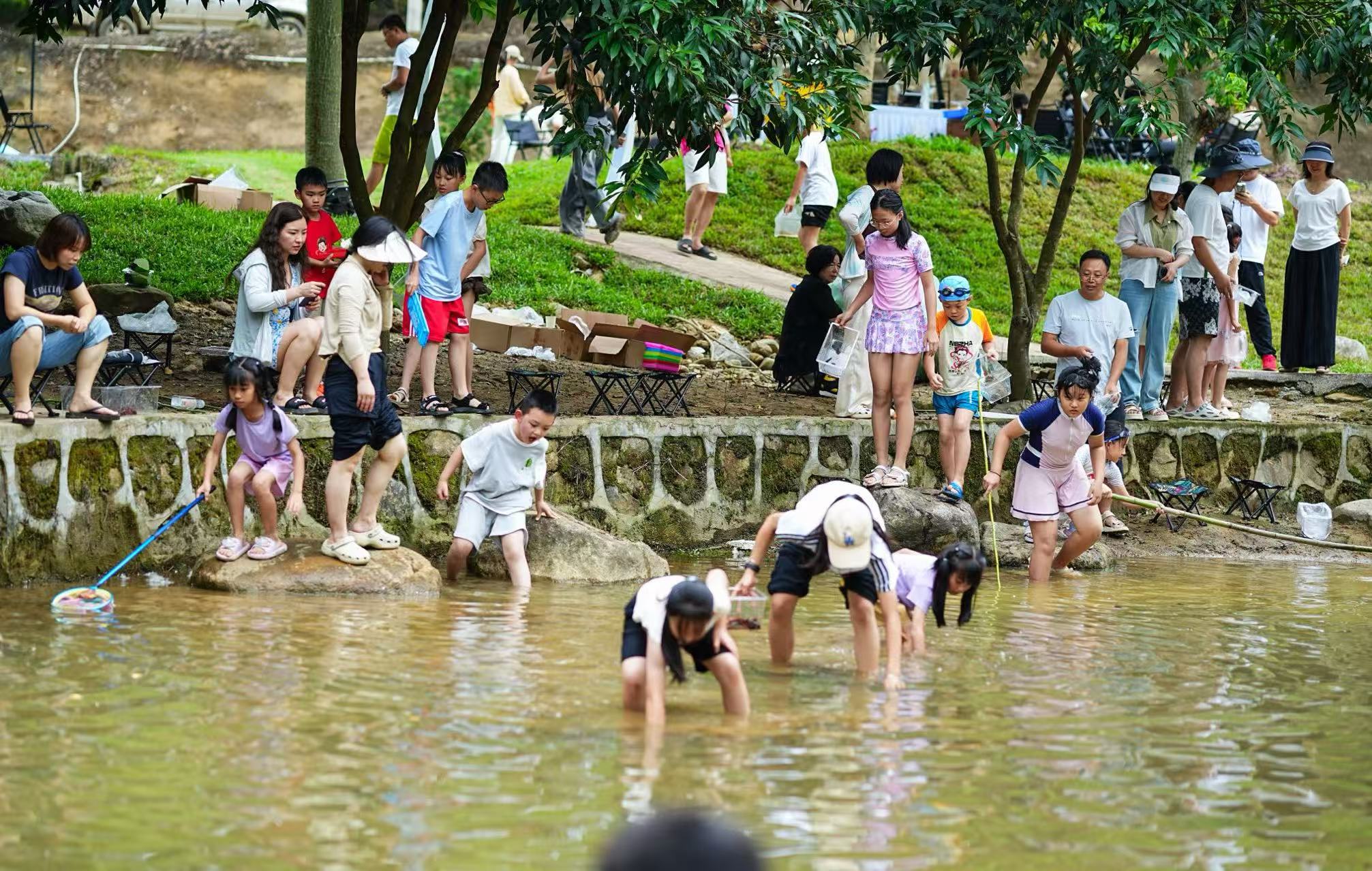 孩子們在黎光村惠州心野輕奢營地摸泥鰍。惠州心野輕奢營地供圖