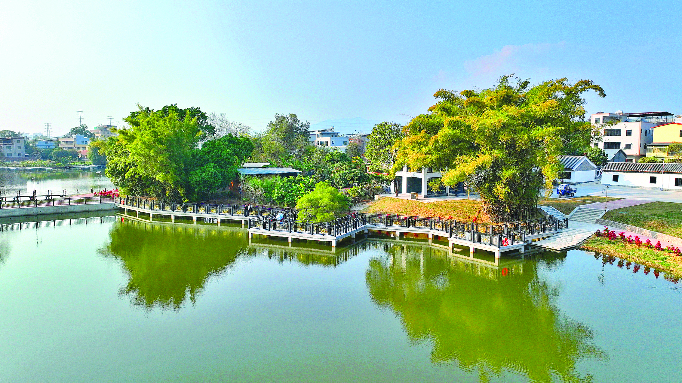 走進(jìn)星光穗園,映入眼簾的是一個(gè)開闊的景觀湖,湖邊親水棧道蜿蜒向前,沿途紅艷艷的三角梅開得正好,一棵茂盛的相思樹橫伸向湖面,生動(dòng)演繹出“疏影橫斜水清淺”的意境。三三兩兩的村民和游客行走其間,停留在一處處美景前打卡。竹林掩映下,修舊如舊的老屋已有商家入駐開門納客。