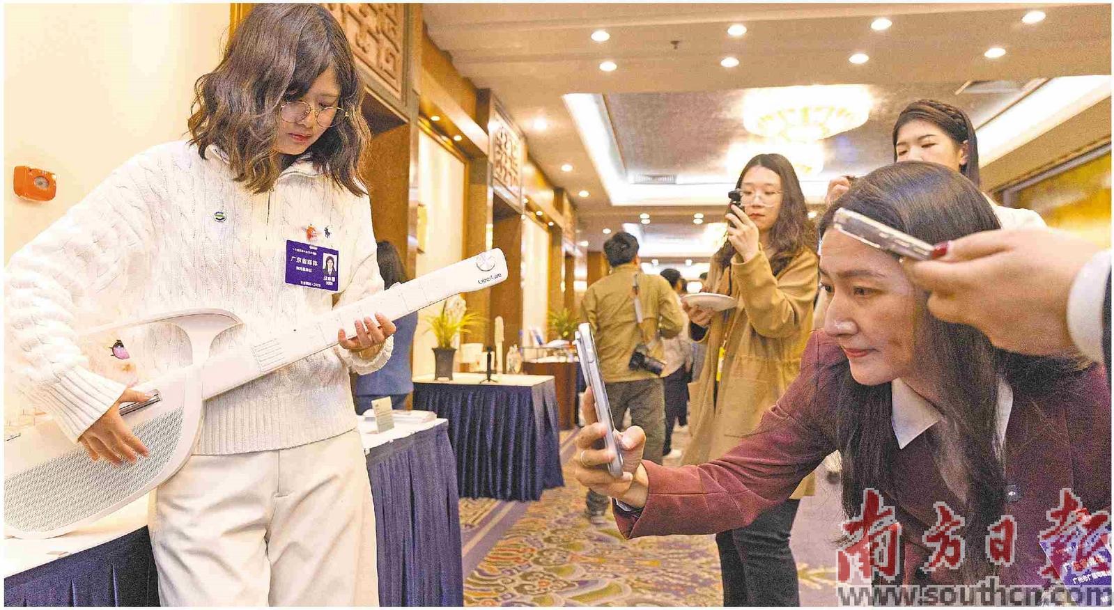 在茶歇區(qū),廣東制造的無弦吉他吸引了媒體的注意力。 南方日報記者 梁鉅聰 攝