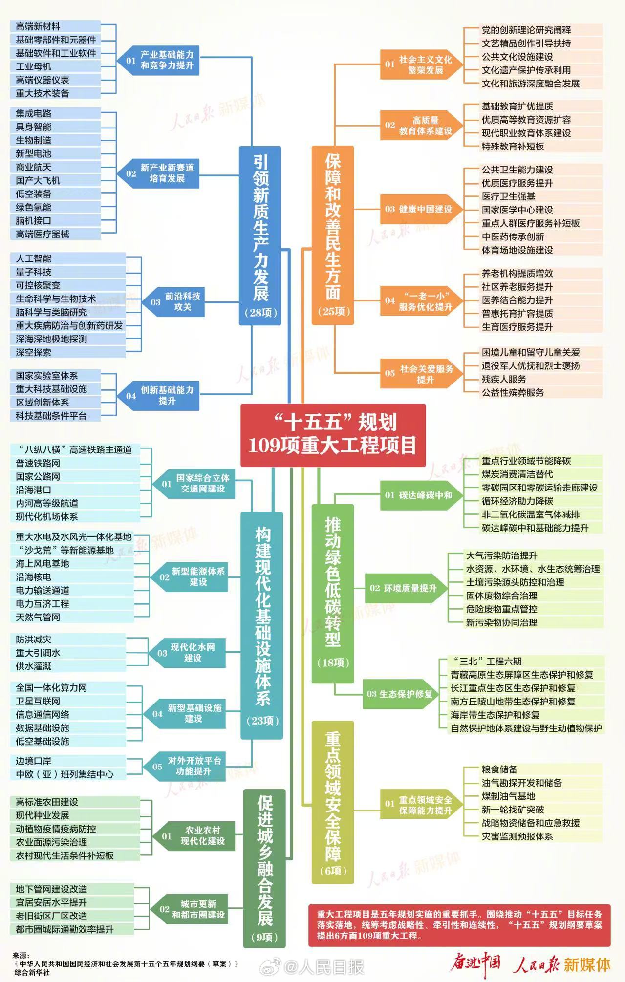 重大工程項(xiàng)目是五年規(guī)劃實(shí)施的重要抓手。圍繞推動(dòng)“十五五”目標(biāo)任務(wù)落實(shí)落地,統(tǒng)籌考慮戰(zhàn)略性、牽引性和連續(xù)性,“十五五”規(guī)劃綱要草案提出6方面109項(xiàng)重大工程。通過一張思維導(dǎo)圖,一起感受奮進(jìn)中國↓
