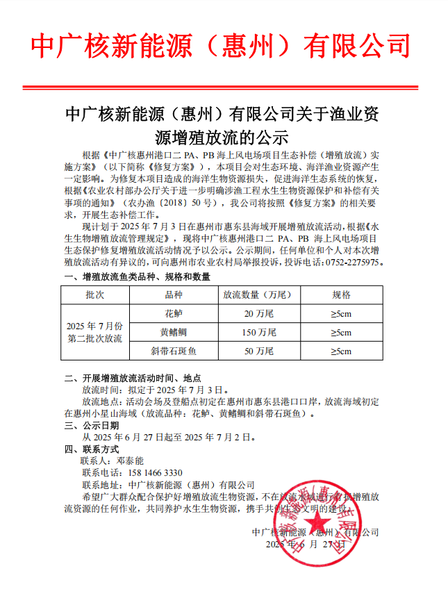 中廣核新能源(惠州)有限公司關(guān)于漁業(yè)資源增殖放流的公示