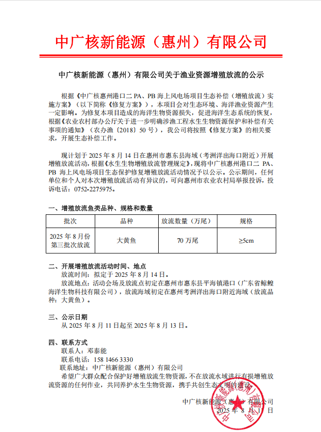 中廣核新能源(惠州)有限公司關(guān)于漁業(yè)資源增殖放流的公示