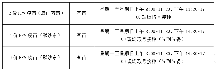 新一輪九價(jià)HPV疫苗已開放九價(jià)宮頸癌疫苗首針免預(yù)約接種(盧屋路接種點(diǎn)、人民六路接種點(diǎn)均有疫苗),無需預(yù)約,帶身份證即可接種。接種當(dāng)天工作時(shí)間均可在三樓自助取號(hào)。