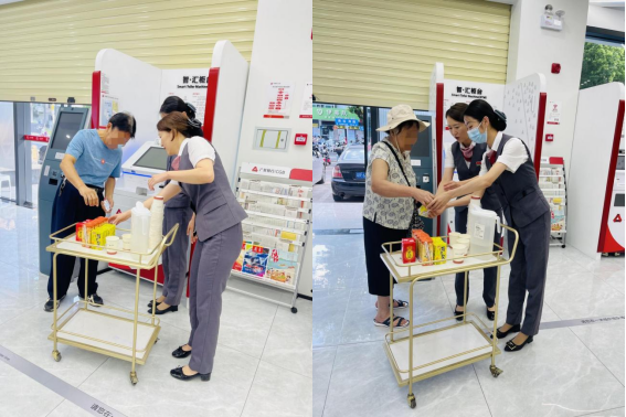 一杯解暑茶,沁人心脾。支行準(zhǔn)備愛心推車,做優(yōu)等候關(guān)懷,為等候叫號的長者客戶送上羅漢果、菊花茶、茉莉花茶、手泡花茶和溫開水等清涼解暑飲品,客戶可根據(jù)口味喜好自由選擇,將關(guān)懷真正送到客戶心坎,讓客戶感受絲絲愜意。