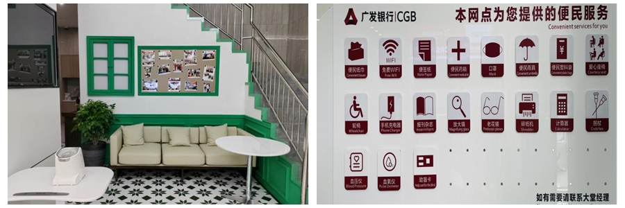 老有所得,適老改造增特色。堅持以人為本,不斷在硬件設施的功能性、實用性、針對性上下功夫,一是升級網(wǎng)點設施,為行動不便的老年人設置無障礙通道、無障礙衛(wèi)生間,配備輪椅、拐杖、放大鏡、不同度數(shù)老花鏡、血壓血氧計、便民藥箱等適老化便民設施;二是打造服務專區(qū),廣泛調研長者客戶喜聞樂見的專區(qū)物件與配色布局,長者服務專區(qū)整體為懷舊設計,通過物件配置與空間改裝形成特色功能區(qū),長者客戶可在長者服務專區(qū)結伴閑坐聊天、享受自助閱讀、免費測量血壓、瀏覽活動趣聞等,感受到賓至如歸的舒適體驗。