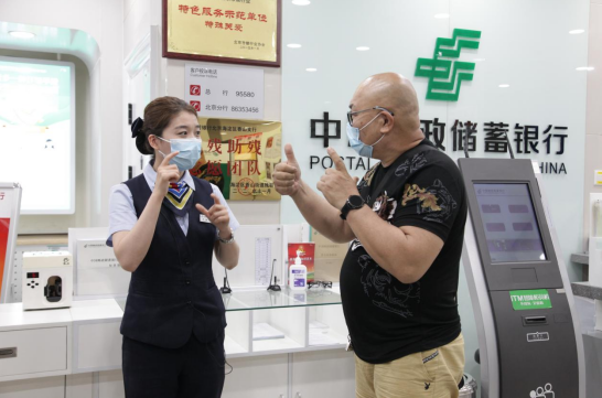 郵儲(chǔ)銀行北京香山支行員工用手語和聽障客戶溝通