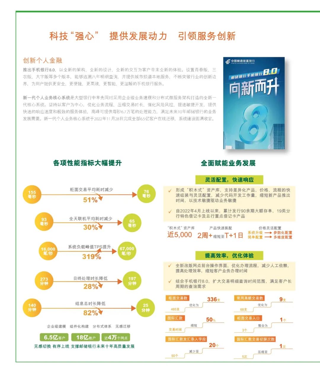 2022年,郵儲(chǔ)銀行新一代個(gè)人業(yè)務(wù)核心系統(tǒng)全面上線,從IT基礎(chǔ)設(shè)施、系統(tǒng)軟件、企業(yè)級(jí)技術(shù)平臺(tái)、應(yīng)用軟件全層面全體系,從業(yè)務(wù)創(chuàng)新、系統(tǒng)研發(fā)、生產(chǎn)運(yùn)營(yíng)全過程全周期,實(shí)現(xiàn)關(guān)鍵技術(shù)自主可控,同時(shí)也是大型銀行中率先同時(shí)采用企業(yè)級(jí)業(yè)務(wù)建模和分布式微服務(wù)架構(gòu)打造的全新一代核心系統(tǒng)。