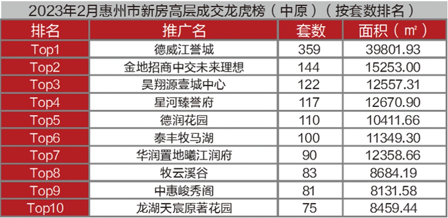 在去庫(kù)存回籠資金的訴求下,不少項(xiàng)目陸續(xù)加入“強(qiáng)促銷(xiāo)”政策陣營(yíng),并取得了較好的去化效果,各大樓盤(pán)紛紛在朋友圈曬出自己的“成績(jī)單”。惠州中原戰(zhàn)略研究中心發(fā)布的全市新房高層成交龍虎榜顯示,2月,共有6個(gè)樓盤(pán)成交量超過(guò)百套,其中德威江譽(yù)城以359套的網(wǎng)簽量位居榜單首位,金地招商中交未來(lái)理想及昊翔源壹城中心分別以144套及122套的成績(jī)位列第二、第三名。