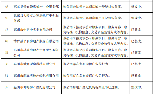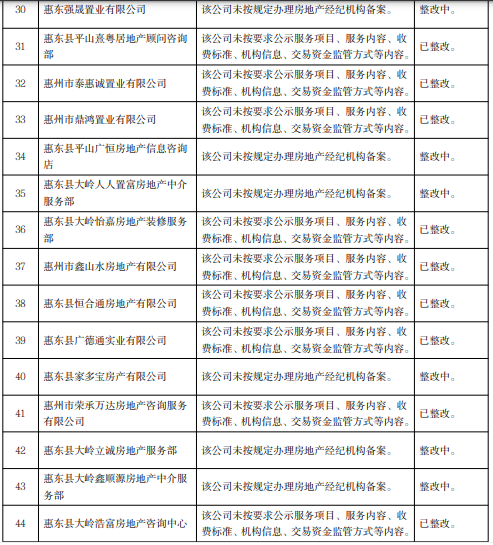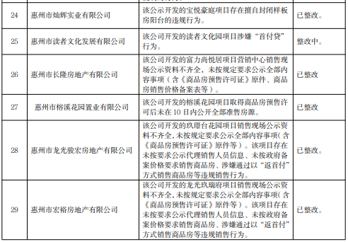 關(guān)注被通報(bào)的29家惠州企業(yè)名單,分別為惠州市讀者文化發(fā)展有限公司、惠州市榕溪花園置業(yè)有限公司、惠州市龍光駿宏房地產(chǎn)有限公司等6家房地產(chǎn)開(kāi)發(fā)企業(yè)和惠東強(qiáng)晟置業(yè)有限公司、惠州市泰惠誠(chéng)置業(yè)有限公司、惠州市斌哥說(shuō)房科技有限公司等23家房地產(chǎn)中介機(jī)構(gòu)。